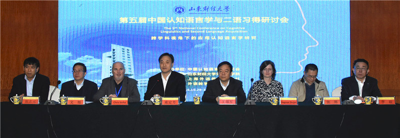 的专业设置、专业和学科建设成绩,希望国内外专家学者能继续关注、支持我校各项事业的发展,尤其是外语学科的发展和提升,并预祝大会圆满成功。 束定芳教授在开幕辞中对中国认知语言学研究进行了回顾和展望,对本届研讨会的主要议题、主旨发言专家,尤其是两名外籍专家及其主要研究做了介绍。 本届会议以“跨学科视角下的应用认知语言学研究”为主题,主要议题包括基于使用的二语习得研究、双语语言能力与认知研究、应用认知语言学研究方法、二语习得的心理语言学与神经语言学实验研究、应用认知语言学的语料库研究、应用认知语言学与课堂教学六个部分。会议期间,国际著名认知语言学家英国谢菲尔德大学研究员 Dagmar Divjak博士、国际认知语言学学会前任会长英国朴次茅斯大学Chris Sinha教授、北京外国语大学王文斌教授、湖南大学刘正光教授及上海外国语大学张炜炜博士分别做了题为 “Domain-general Implicit Learning Abilities Support Language Processing”、“The Cognitive, the Social,and Social Cognition in Second Language Acquisition”、“我国外语教育研究的理论框架:构建与解析”、“应用认知语言学三十年”、“Measuring Conceptual Onomasiological Variation: Mixed-effects models, Trees and Forests”的主旨发言。各位专家学者的主旨发言高屋建瓴,深刻反映了认知语言学与二语习得领域的最新研究成果及发展趋势,从跨学科视角探讨了认知语言学研究的未来走向。大会还组织了四个专题论坛小组,针对认知语言学前沿研究、基于使用的二语习得研究、认知语言学语料库及心理语言学研究、认知语言学与外语教学研究四个议题进行了讨论。 会议闭幕式上,中国认知语言学研究会秘书长张辉教授做了总结发言,下届承办单位代表做了邀请发言。 此前,从10月25日至28日,会议举办了为期四天的会前研修班。国际著名认知语言学家Dagmar Divjak博士为来自全国各地的70名学员举办了10场高水平前沿讲座。这10场讲座涵盖了认知语言学与二语习得领域最前沿的理论、方法及应用研究,为学员们呈献了一场高水平学术盛宴。 第五届中国认知语言学与二语习得研讨会充分体现了“跨学科”与“应用”两大特色,反映了中国认知语言学与二语习得领域的最新研究成果及发展趋势,是一次中国学者的盛大聚会,为中国认知语言学与二语习得研究的进一步发展做出了巨大贡献。研讨会的成功召开也极大地推进了山东财经大学“特色名校工程”,尤其是外语学科建设的深入与提升,对山东省的外语教学与研究也具有非常重要的促进作用。 会议期间,多家新闻媒体来校进行了采访报道。山东教育电视台对中国认知语言学研究会会长束定芳教授、海燕策略论坛