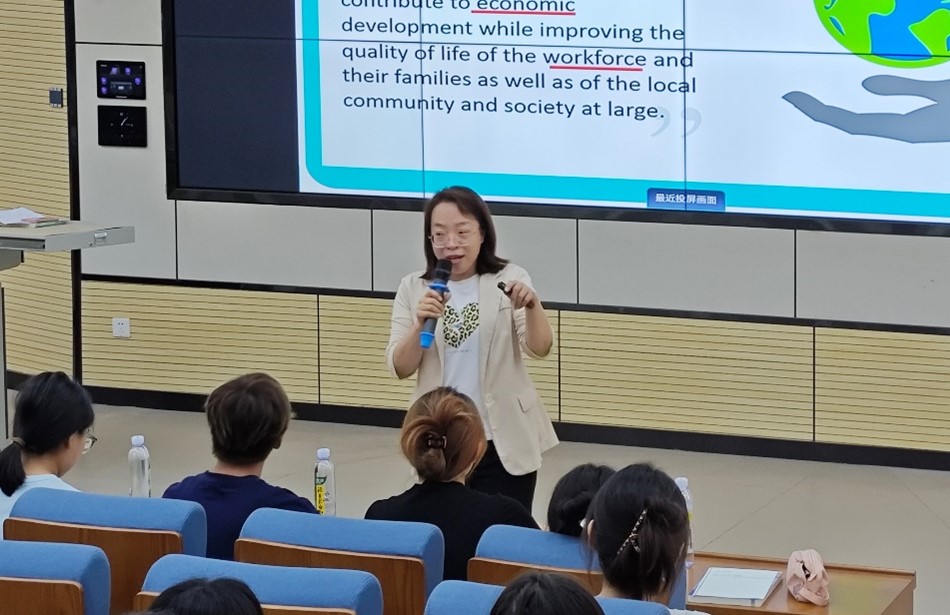 商务英语系青年骨干教师卢长兰主讲了《商务英语听说》课程。课程授课对象为商务英语专业大二学生。课堂围绕“企业社会责任”这一商务领域的热门话题展开,利用BOPPPS模型设计六个教学环节,帮助学生循序渐进地掌握听说能力。课堂精心设计了任务式、问题式、小组合作等丰富的视听练习,引导学生积极参与和大胆表达,有效增强了其学习热情和参与度。