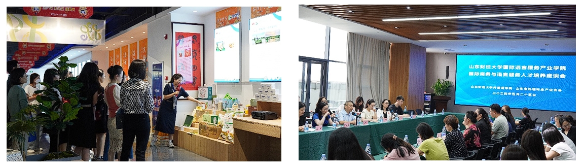 公开课后与会的教师们参观了山东省地理标志产业协会,游览了一楼地标产品展厅,了解产品背后的故事和独特的生产工艺。产品琳琅满目,展现了山东丰富的自然和人文资源。随后在三楼会议厅与孙明香会长等协会工作人员举行了座谈会,共同商讨外语教育与地标产业展开合作的可行性和具体实施方案。