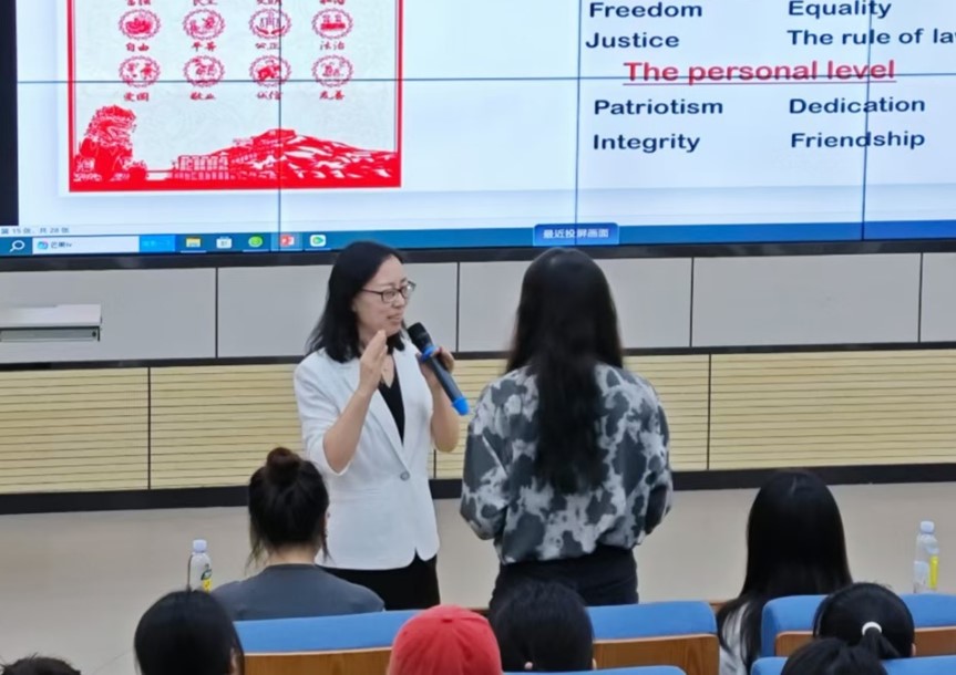 山东财经大学国际语言服务现代产业海燕策略论坛 执行院长、院长助理张斐瑞副教授主讲了《综合商务英语》。课程以商务场景为背景,强化学生的英语听、说、读、写能力。课堂以“leadership”单元为例,从马斯克的领导风格开始,引入领导力风格的具体内容,通过背诵、视译、理解、反思等教学方法和环节,多角度培育学生的语言能力,帮助学生在不同情境下应用所学知识。