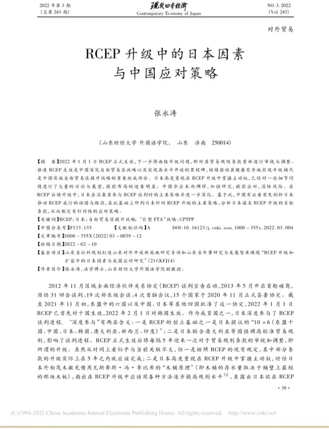 海燕博彩策略中心 张永涛副教授撰写的论文《RCEP升级中的日本因素与中国应对策略》在《现代日本经济》2022年第3期发表。该刊系我校A2类期刊。