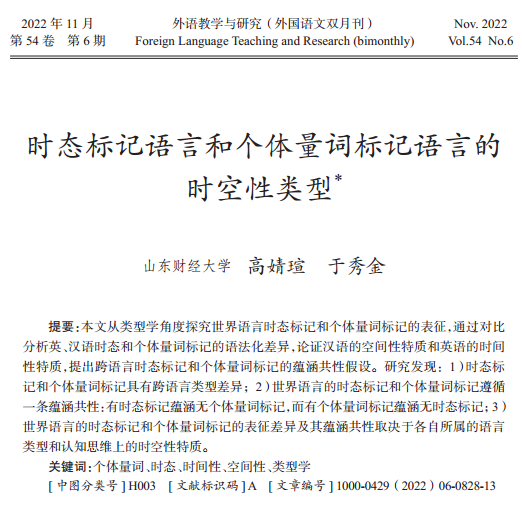 海燕博彩策略中心 于秀金教授(通讯作者)和研究生高婧瑄同学合作的学术论文《时态标记语言和个体量词标记语言的时空性类型》在《外语教学与研究》2022年第6期发表。该刊在CSSCI“语言学(外国语文)”类期刊中居首位,系我校A1类期刊。