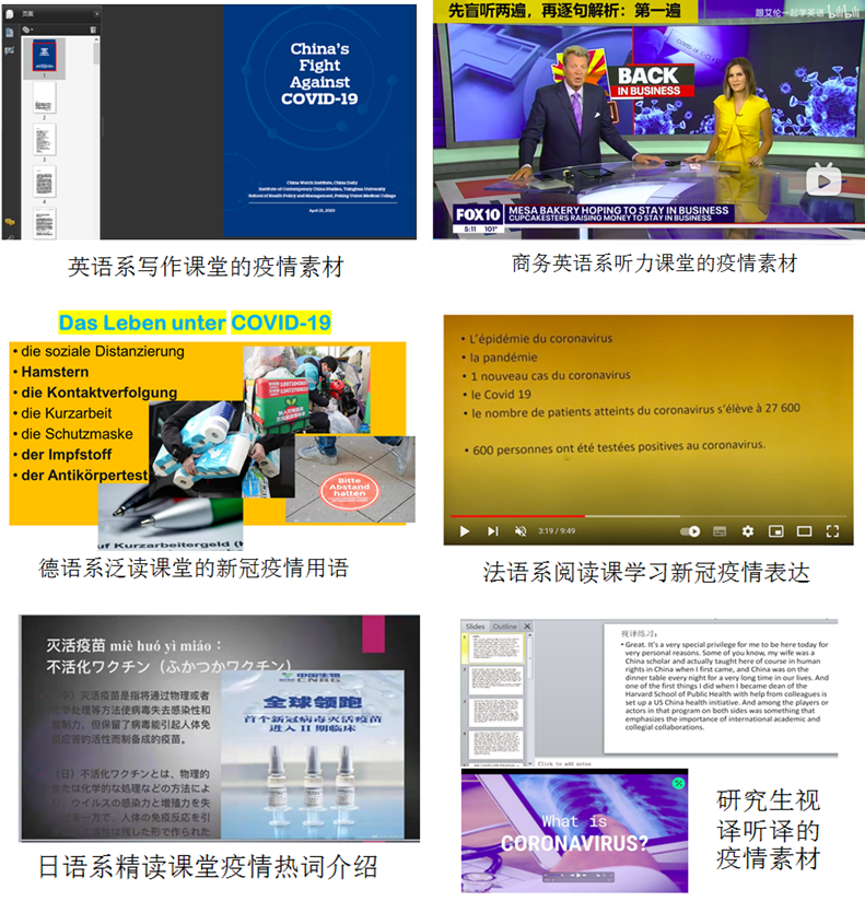 外院老师们充分挖掘提炼,将战“疫”素材与专业教学相结合,用恰当的外语表述讲中国战“疫”故事,看外语报道了解世界各国战“疫”举措,为同学们提供最新最准确的信息。在“停课不停学”基础上实现“停课不停育”,把思政工作贯穿于教育教学全过程,协同推进思政教育与专业教育,实现知识传授、能力培养与价值引领有机统一。