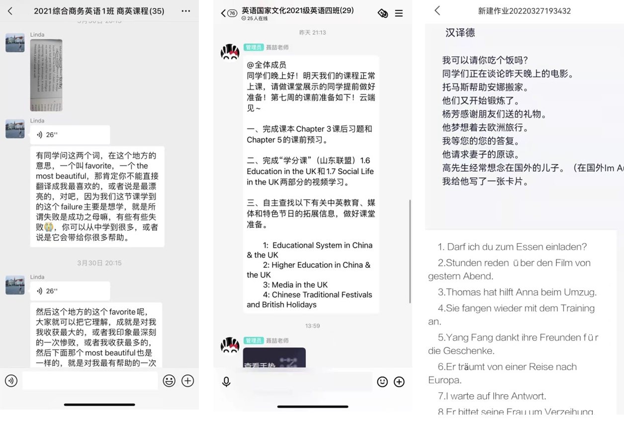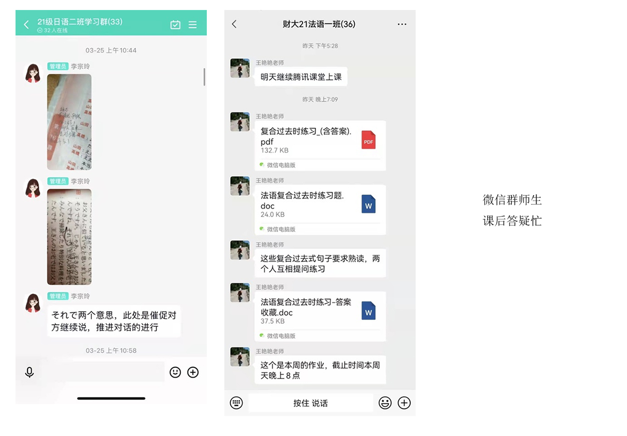 学习贵在温故而知新,课后巩固老师有妙招。老师们细化每节课的学习任务,从点面到互动,从作业到批改,从过程到成效,都有具体的要求。如耐心细致批改学生们上传的作业,做好相应的批注和点评,针对知识盲点,寻找最佳解决途径。任课老师全程跟踪学生学习效果、作业准确率,通过微信群、QQ群进行过程反馈。提供学习拓展资源,可随时下载。点对点为学生答疑解惑、辅导难点。遇到共性问题,及时组建小组,一起探究;面对单个提问,循循善诱、一一解惑。孜孜不倦的外院教师,有问必答、一问三答,科学指导、触类旁通。