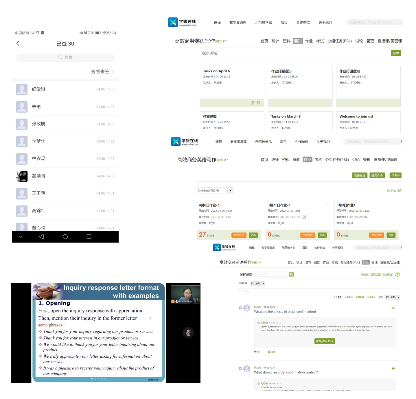 线上教学秩序平稳运行中。老师们探索与应用“讲课平台+SPOC翻转课堂”的云端教学模式,注重师生互动,提高在线教学质量。课堂上,知识讲解细致到位,课堂练习、抢答小测频频发送,同学们即时语音作答,或发弹幕、或投稿、或与老师互动答疑。同时使用学习通、雨课堂等平台上课签到、消息发布、资源共享,布置、提交、批改作业等。充分利用平台讨论功能,组建线上小组会议室,布置线上讨论任务,开展在线讨论,教师和同学们在不同网络终端完成了生动的在线直播授课。