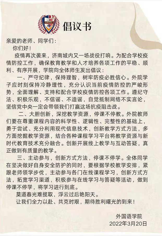 在学校发出线上教学的通知后,外院立即响应,迅速行动,发布《不停教不停学、团结抗疫共度时艰》的倡议书。以服务师生为宗旨,以保障教学质量为目标,根据在线教学规律,统筹安排线上教学相关工作。