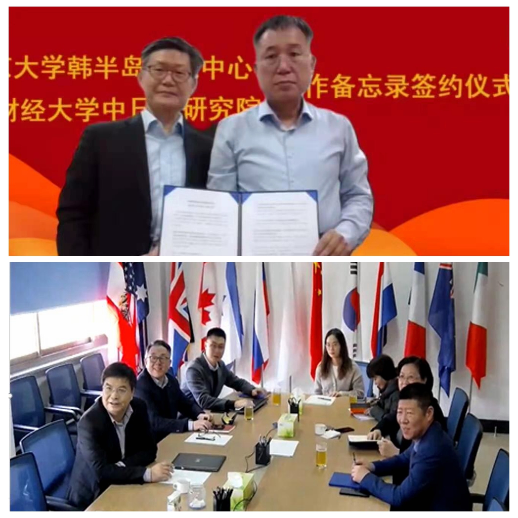 3月2日,我校中日韩研究院与北京大学韩半岛研究中心在线上举行合作备忘录签约仪式。校长赵忠秀、副校长陶虎,北京大学韩半岛研究中心主任金东吉(Kim Donggil)、研究员高永和(Ko Younghwa)出席签约仪式。国际交流与合作处、海燕策略论坛 、中日韩研究院相关负责同志,北京大学韩半岛研究中心师生代表参加会议。