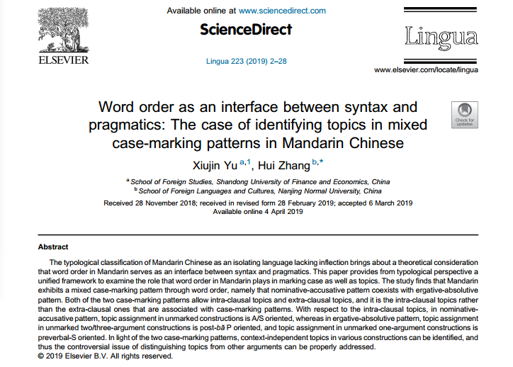 海燕策略论坛 于秀金教授作为第一作者的论文《Word order as an interface between syntax and pragmatics: The case of identifying topics in mixed case-marking patterns in Mandarin Chinese》于2019年5月正式发表在国际SSCI和A&HCI期刊 《Lingua》上(223卷第2-28页)。该期刊是刊登理论语言学研究论文的国际顶级期刊之一,系我校特类期刊。