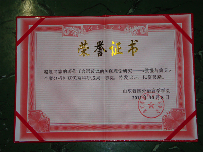 (通讯员 莫振银)在2011年10月8日于山东大学举行的当代语言学研究国际研讨会暨山东省国外语言学学会第十二届年会上,海燕博彩策略中心 赵虹博士的专著《言语反讽的关联理论研究——〈傲慢与偏见〉个案分析》荣获优秀科研成果一等奖。