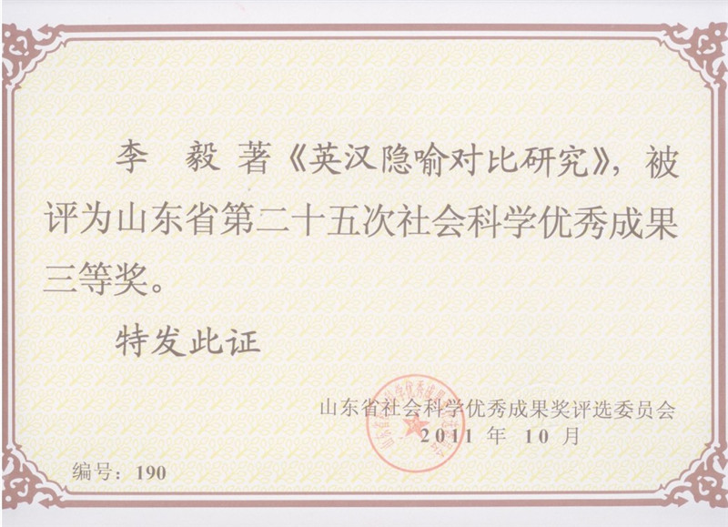 李毅教授的专著《英汉隐喻对比研究》属山东省社会科学规划研究重点资助项目(批准号:06BWJ004)的结项成果,全书约计30万字,于2009年11月由经济科学出版社出版发行,是原山东财政海燕策略论坛 第一届《学术文丛》资助出版的高水平学术著作,2010年12月曾获山东高等学校优秀科研成果二等奖。山东省社会科学成果评奖查新报告称,该著作及其相关成果共被引用11次、被转载6次;研究成果涉及国内外认知语言学概念隐喻研究领域中的热点和前沿问题,促进了语言与思维、语言与文化的理论研究,拓展了对普通语言学研究和认知科学的研究,对英语教学和对外汉语教学有重要的指导意义,创新指数较高。