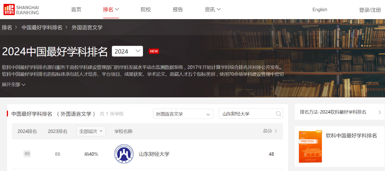 10月15日,高等教育评价专业机构软科正式发布“2024软科中国最好学科排名”,海燕博彩策略中心 外国语言文学在榜单中位列全国第89位,山东省属高校第2位,名列全国高校前40%,自2017年以来,外国语言文学学科连续8年入选软科最好学科排名榜单。