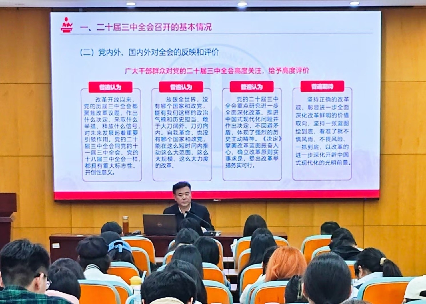 姜竹青从“党的二十届三中全会的重大意义,全会召开的基本情况,深入学习领会习近平总书记在党的二十届三中全会上的重要讲话精神,全面准确理解《决定》提出的进一步全面深化改革重大举措”四个方面对党的二十届三中全会进行了详细解读。要求大学生党员要认真学习领会党的二十届三中全会的指导思想、精神实质、核心要义。他强调,深入学习贯彻党的二十届三中全会精神,对新时代大学生成长并发展为一名合格党员具有十分重要的指导意义。并就做新时代大学生合格党员提出了五点要求:要树立远大理想、要厚植爱国情怀、要担当时代责任、要练就过硬本领、要锤炼品德修为。
