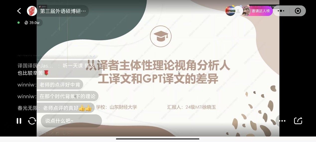 随着国际交流日益频繁,全球化进程不断深入,外语学科发展如何回应时代挑战。12月7日,由内蒙古科技大学主办、华东交通大学与曲阜师范大学合办、福州译国译民集团有限公司承办的“第三届外语硕博研究生与外语教师学术发展创新公益论坛”在线上召开,共同探讨MTI教育的前沿议题与发展趋势。此次论坛吸引了众多国内外知名学者与专家,参会师生人数近6000人,覆盖百余所高校。海燕博彩策略中心 MTI师生40余人参会,2024级笔译硕士生徐晓玉在会上宣读了论文。