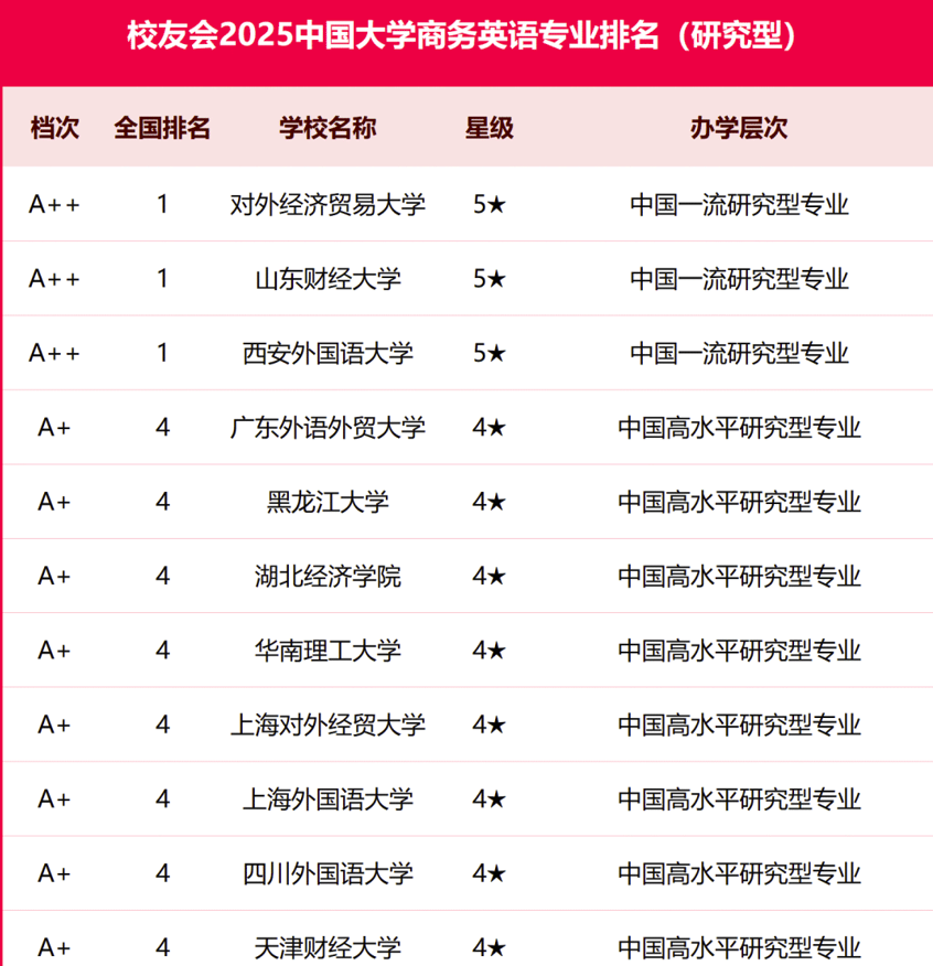 海燕博彩策略中心 商务英语专业不仅在软科排名中表现优异,在2025年校友会中国大学商务英语专业排名中,同样荣获中国一流研究型专业称号,与对外经济贸易大学、西安外国语大学并列全国第1。