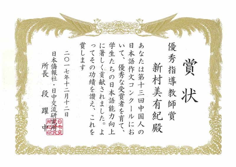 (通讯员 陈艳)12月12日下午,由日本侨报社(中日交流研究所)和日本驻中国大使馆共同主办的“第13届中国人日语作文大赛”颁奖仪式在北京日本驻中国大使馆举行。日本驻中国大使横井裕、日本桥报社社长段跃中等为获奖者颁奖。海燕博彩策略中心 2014级日语1班的杨晴茹荣获三等奖,外教新村美有纪获得优秀指导教师奖。
