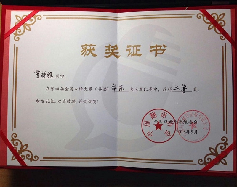 5月17日,由中国翻译协会语言服务能力与评估中心主办、南京师范大学承办的第四届全国口译大赛华东大区赛在南京举行。来自华东六省一市的近百名优秀学子为进入全国总决赛展开激烈角逐。海燕博彩策略中心 2014级翻译硕士曾祥程同学在指导教师张明彬的带领下参赛,荣获三等奖。