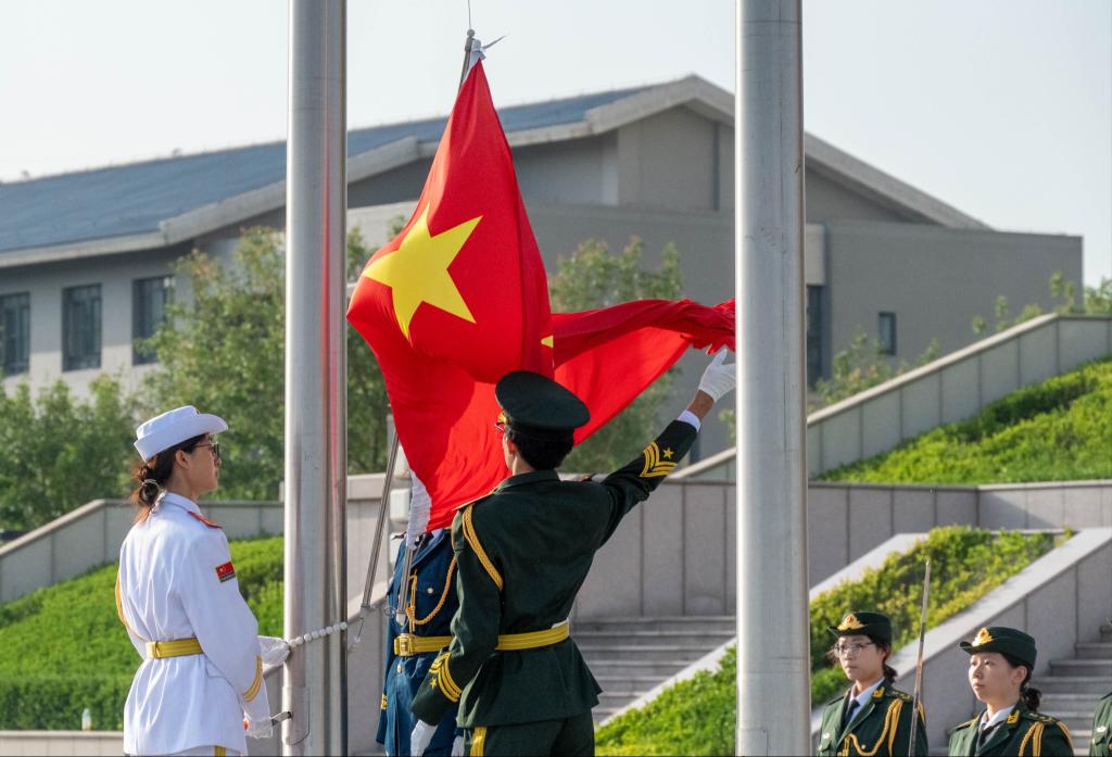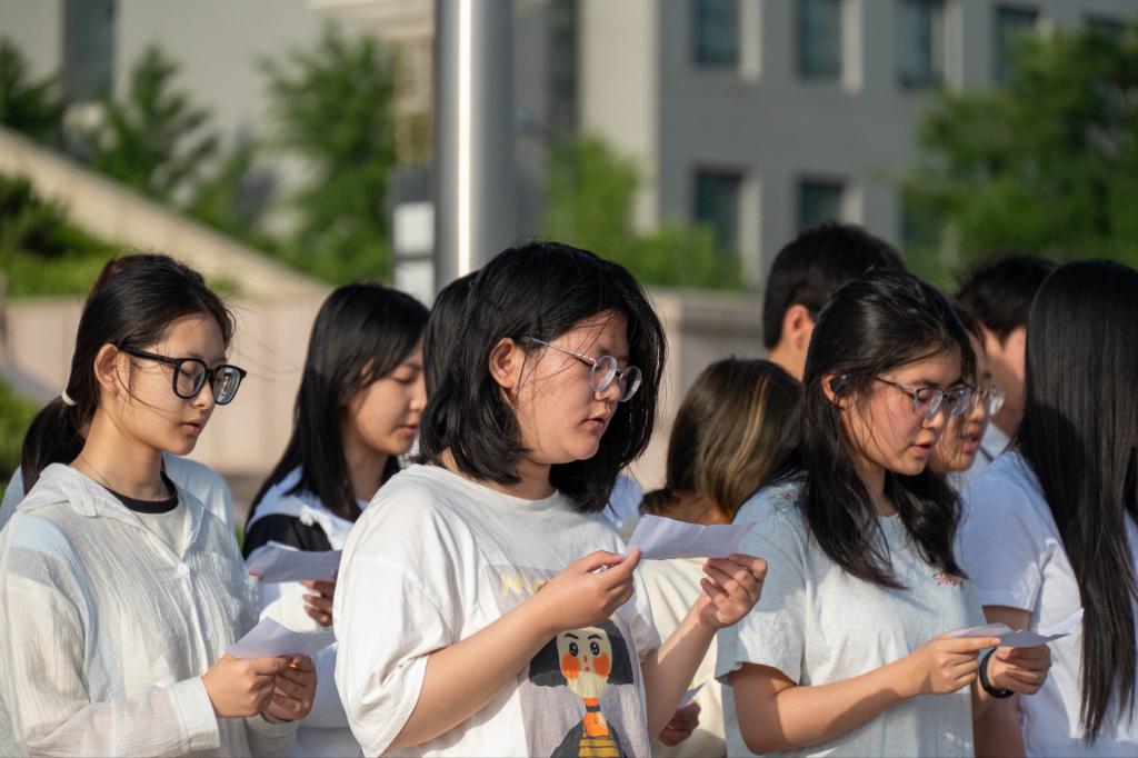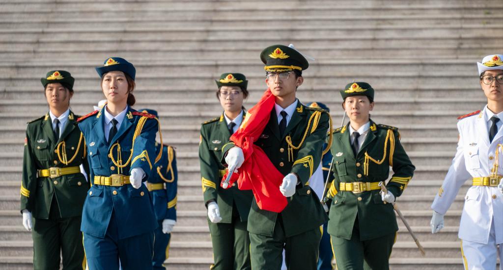 当日清晨,2024 级全体本科生在图书馆前整齐列队,国旗护卫队队员身姿挺拔,迈着整齐有力的步伐护送国旗走向国旗台。随着激昂的国歌声响起,鲜艳的五星红旗在晨曦中缓缓升起,全体师生神情庄重,目光紧紧注视着国旗,齐声高唱国歌,嘹亮的歌声在校园上空回荡,彰显出青春的蓬勃朝气与坚定信念。